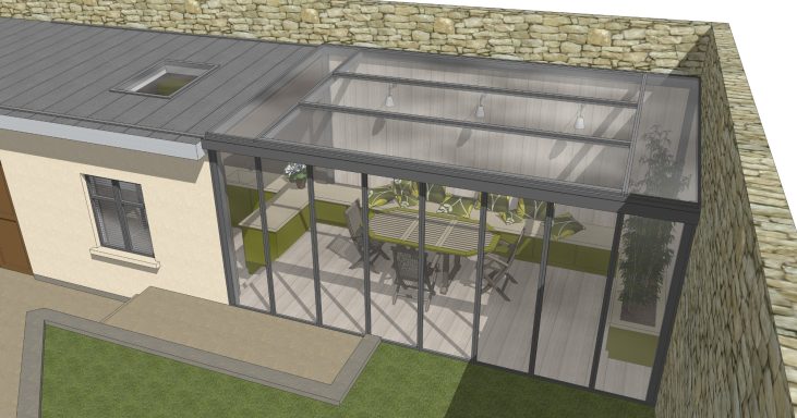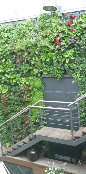 Des murs pignons autrefois disgracieux et un escalier de service métallique sans charme se transforment aujourd'hui en un véritable havre de paix. L'ajout d'un mur végétalisé et d'une fontaine, sublimés par l'élégance naturelle de l'ardoise, métamorphose cet espace en un lieu empreint de sérénité et d'harmonie. Ce coin s'intègre désormais avec grâce au patio, offrant une ouverture directe sur le salon principal, invitant à la détente et à l'inspiration.
